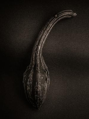 A series of Black and White photos of assorted seasonal fruits that over time have been used as objects of art, tools, musical instruments and food.